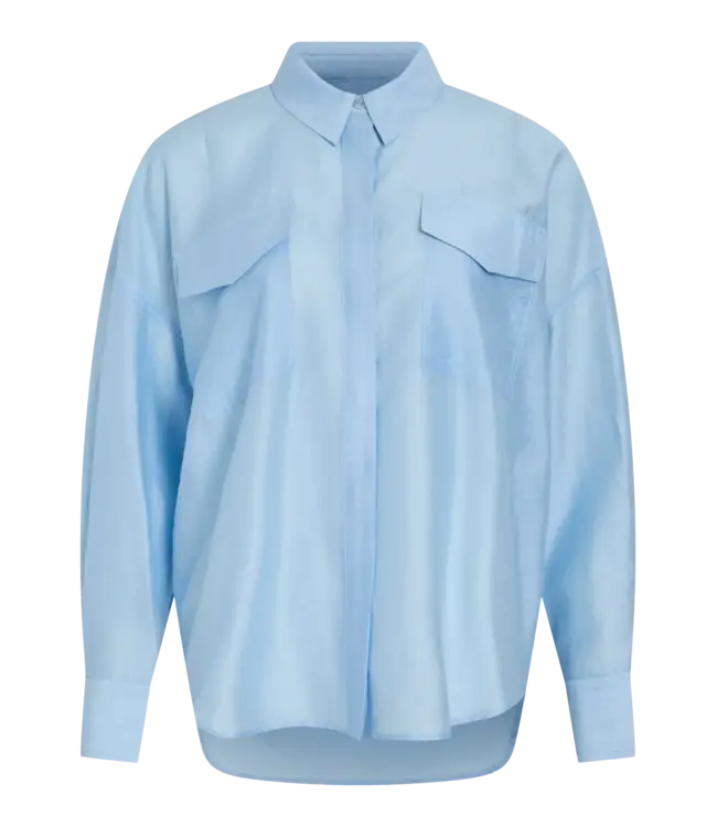 De ROUGE EDIT Long‑sleeved Shirt in Clear sky is een oversized long sleeve met een onzichtbare knopen, dubbele zakken en dropped shoulders voor een relaxed silhouet. Het lichte, non‑stretchweefsel voelt soepel aan op de huid en geeft een moderne, casual look.