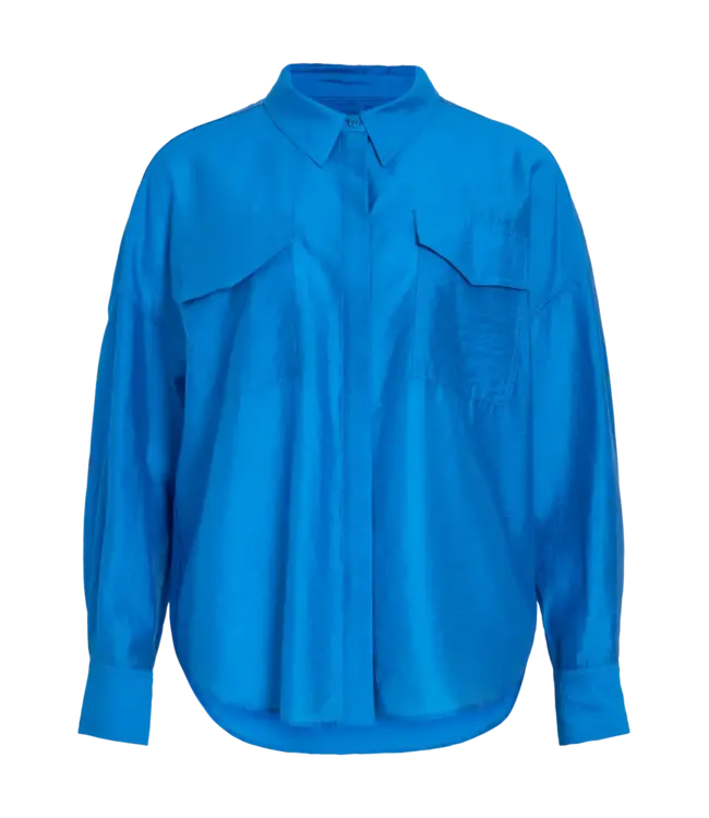 De ROUGE EDIT Long‑sleeved Shirt in Directoire Blue is een oversized long sleeve met een onzichtbare knopen, dubbele zakken en dropped shoulders voor een relaxed silhouet. Het lichte, non‑stretchweefsel voelt soepel aan op de huid en geeft een moderne, casual look.