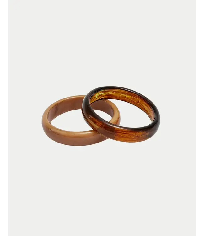 Deze set van armbanden is een echte eye catcher en straalt een subtiele, minimalistische luxe uit. De combinatie van warme bruin- en beigetinten zorgt voor een nonchalante maar chique uitstraling, waardoor je deze bangles eindeloos kunt combineren met zowel casual als meer geklede outfits.