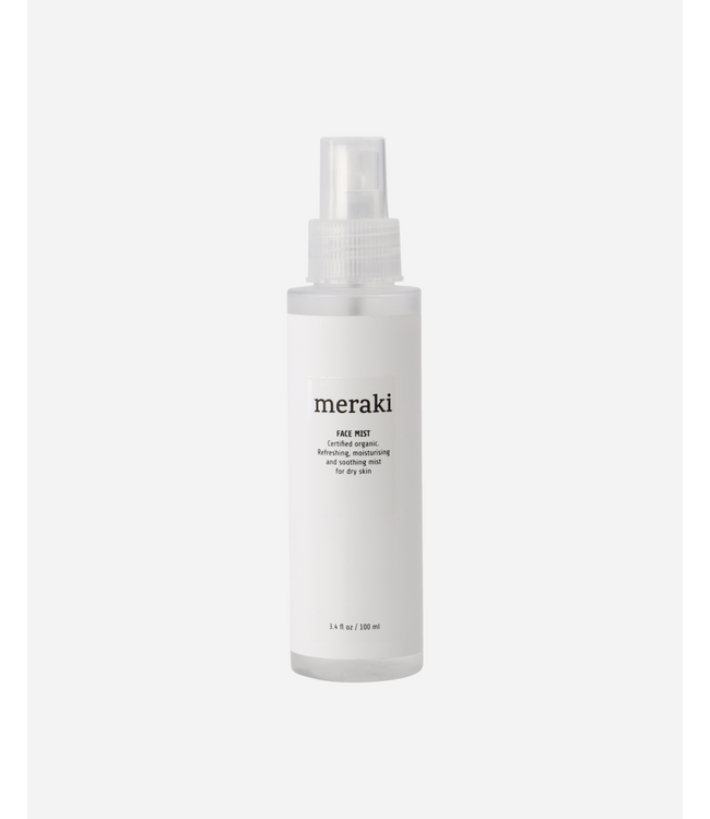 De Meraki Face Mist is verrijkt met Earth Marine Water dat de huid voorziet van mineralen en een antioxidant effect heeft, en helpt bovendien de zichtbaarheid van poriën te verminderen. Aloë vera en glycerine dragen bij aan het behouden van de natuurlijke vochtbalans en elasticiteit van de huid voor een frisse, gehydrateerde teint op elk moment van de dag. De mist is ECOCERT‑gecertificeerd en voorzien van het Nordic Swan ecolabel, zonder parabenen en kunstmatige kleurstoffen, en geschikt voor alle huidtypen.