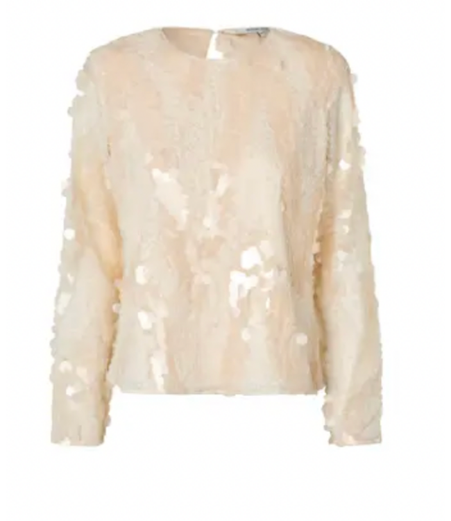 De Second Female Sequin Blouse is een echte statement piece. De combinatie van glinsterende pailletten en een transparante 3D-stof op een tonale mesh-ondergrond geeft de blouse een luxueuze, feestelijke uitstraling. Met schoudervullingen, lange mouwen en een subtiele keyhole-sluiting op de rug straalt ze elegantie en kracht uit.