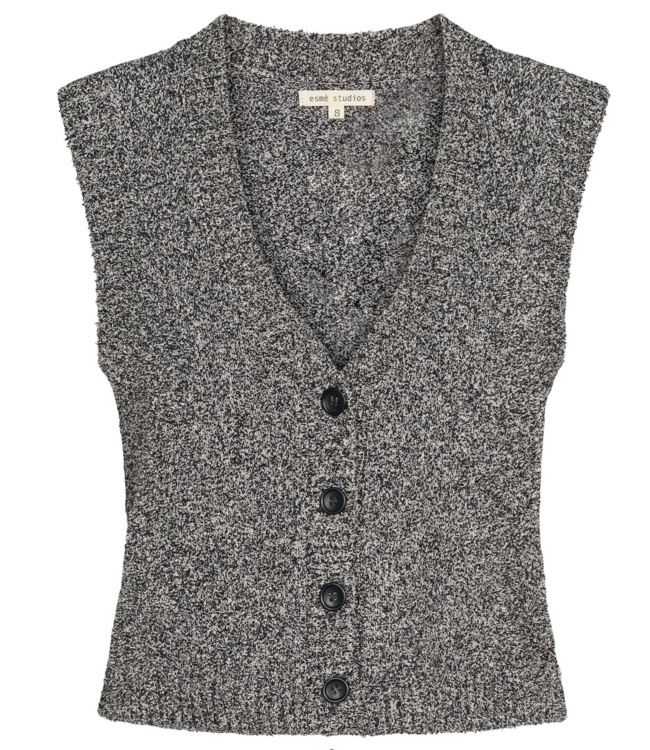De ESPhilo Knit Vest in Black Mélange van esmé studios is perfect om stijlvol laagjes te dragen. Draag het sleeveless op een jeans, of over een blouse of long sleeve. Perfect te combineren met zowel casual als geklede outfits. Een must-have voor een minimalistische en elegante look.